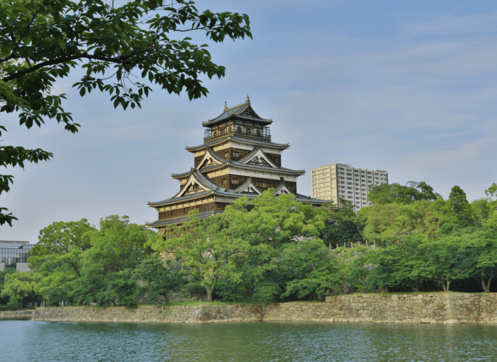 Costruito nel 1589 dal potente signore feudale Mori Terumoto, il castello di Hiroshima fu distrutto in seguito allo sgancio della bomba atomica nel 1945. Il suo mastio principale è alto cinque piani ed il suo terreno è circondato da un fossato. All'interno del recinto del castello si trovano anche un santuario, delle rovine e alcuni edifici ricostruiti del Ni-no-maru (il secondo cerchio di difesa).