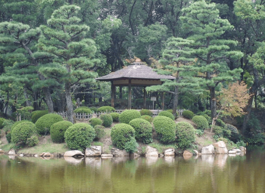 La costruizone del giardino Shukkei-en iniziò nel 1620 durante il periodo Edo per ordine di Asano Nagaakira, daimyō del feudo di Hiroshima. Il giardino mostra molte caratteristiche dell'estetica tradizionale dei giardini giapponesi, ed è uno spazio verde in cui valli, montagne e foreste sono rappresentate in miniatura. In prossimità dello stagno si trovano una serie di case da tè che offrono ai visitatori viste mozzafiato del paesaggio circostante.